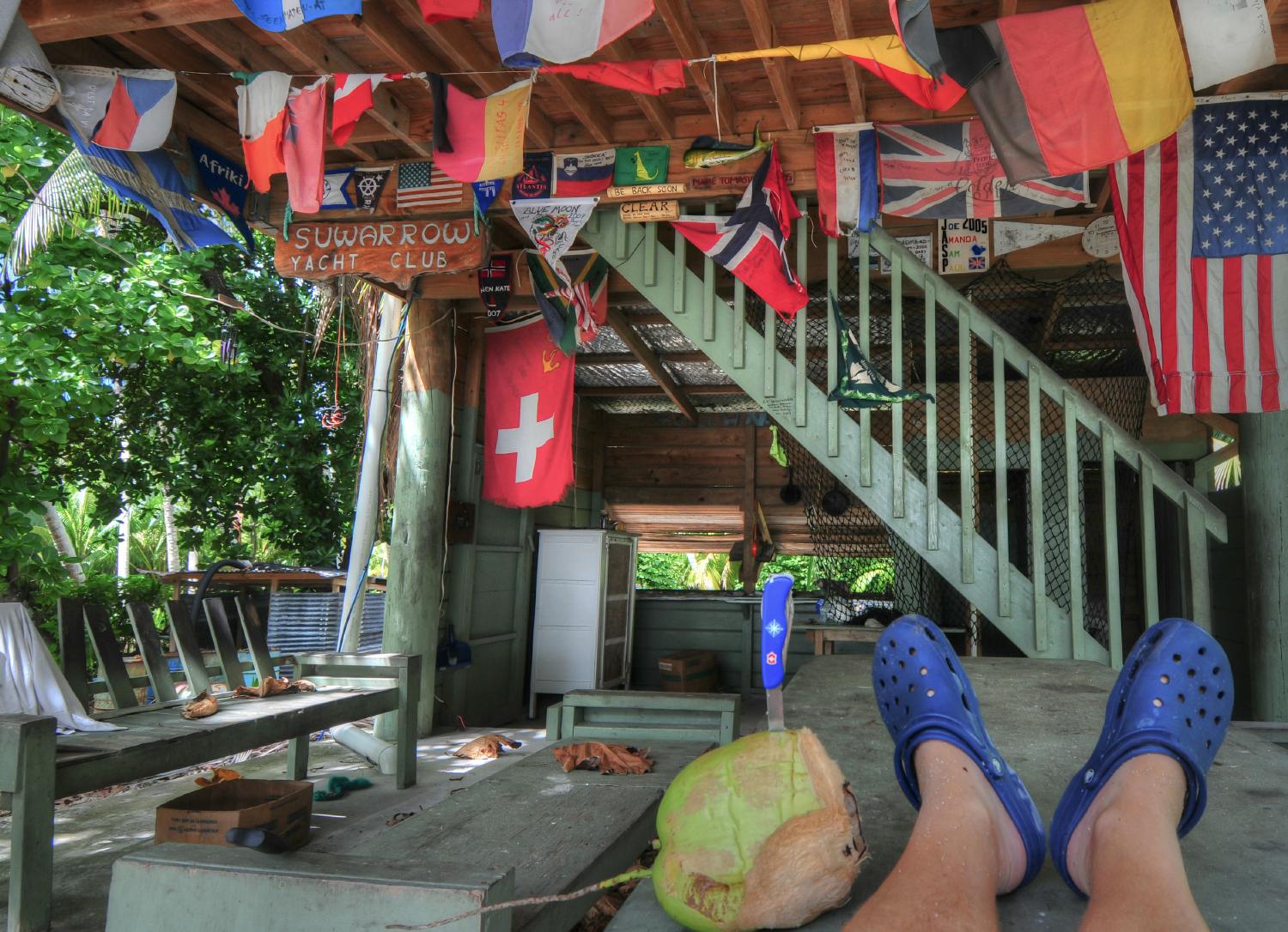 Mitten auf Suwarrow steht ein uriger "Kleinstadt"-Club – wenn auch meistens ohne Gäste. In der Hochsaison schaut tatsächlich mal ein „Care-Taker“ aus Neuseeland vorbei, um die Nationalpark-Gebühren einzusammeln (die Insel muss ja auch ihre Rechnungen bezahlen!). Doch den Rest des Jahres döst der Club friedlich vor sich hin, umgeben von allerlei nautischem Gerümpel, das auf bessere Tage hofft.