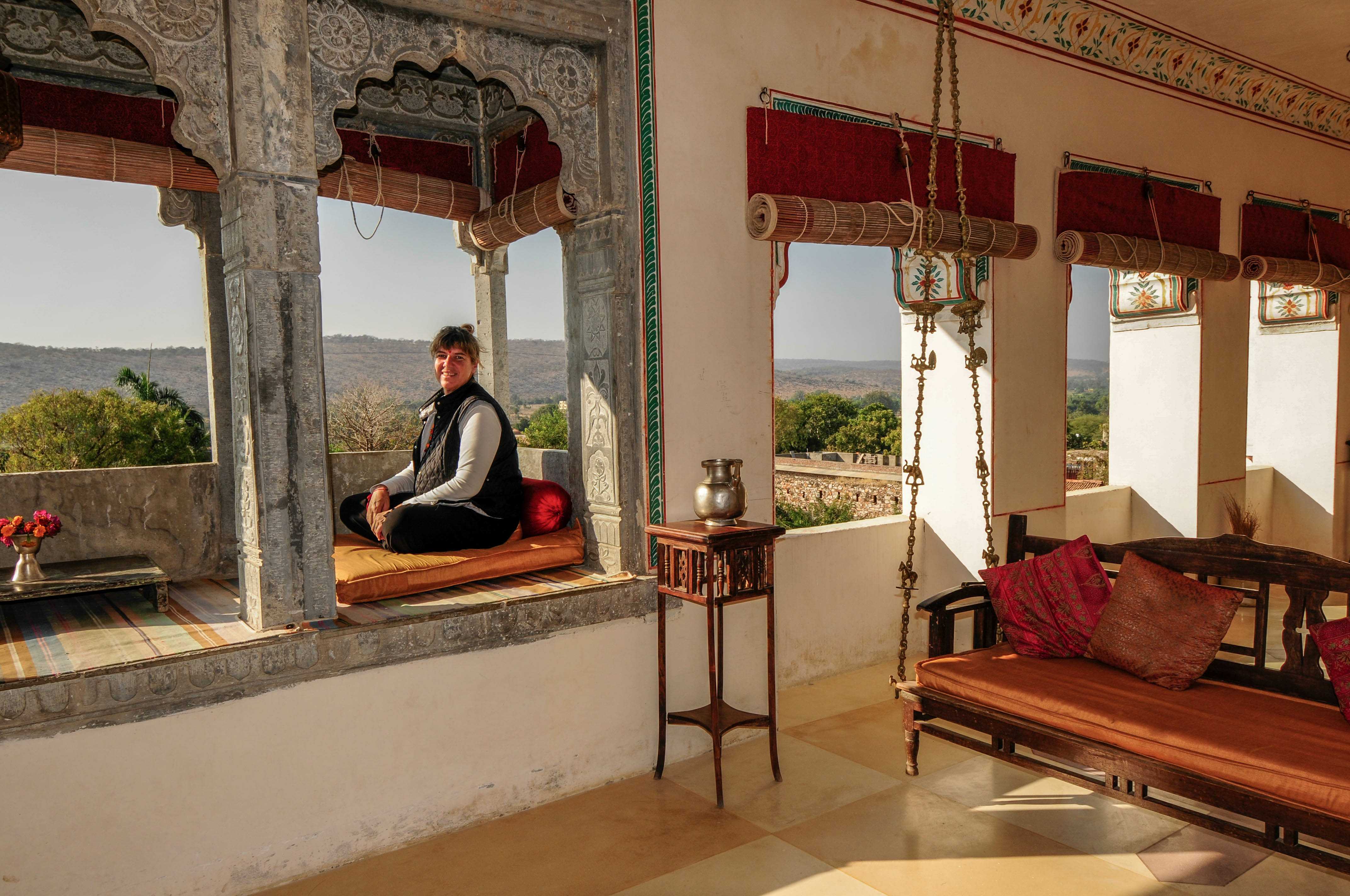 Die Terrasse bei Sonnenuntergang: Wenn die Wasservögel ihre Runden drehen und die Miniaturmalereien an den Wänden golden glühen, versteht man: Das ist Rajasthan, wie es im Reiseführer nie steht.