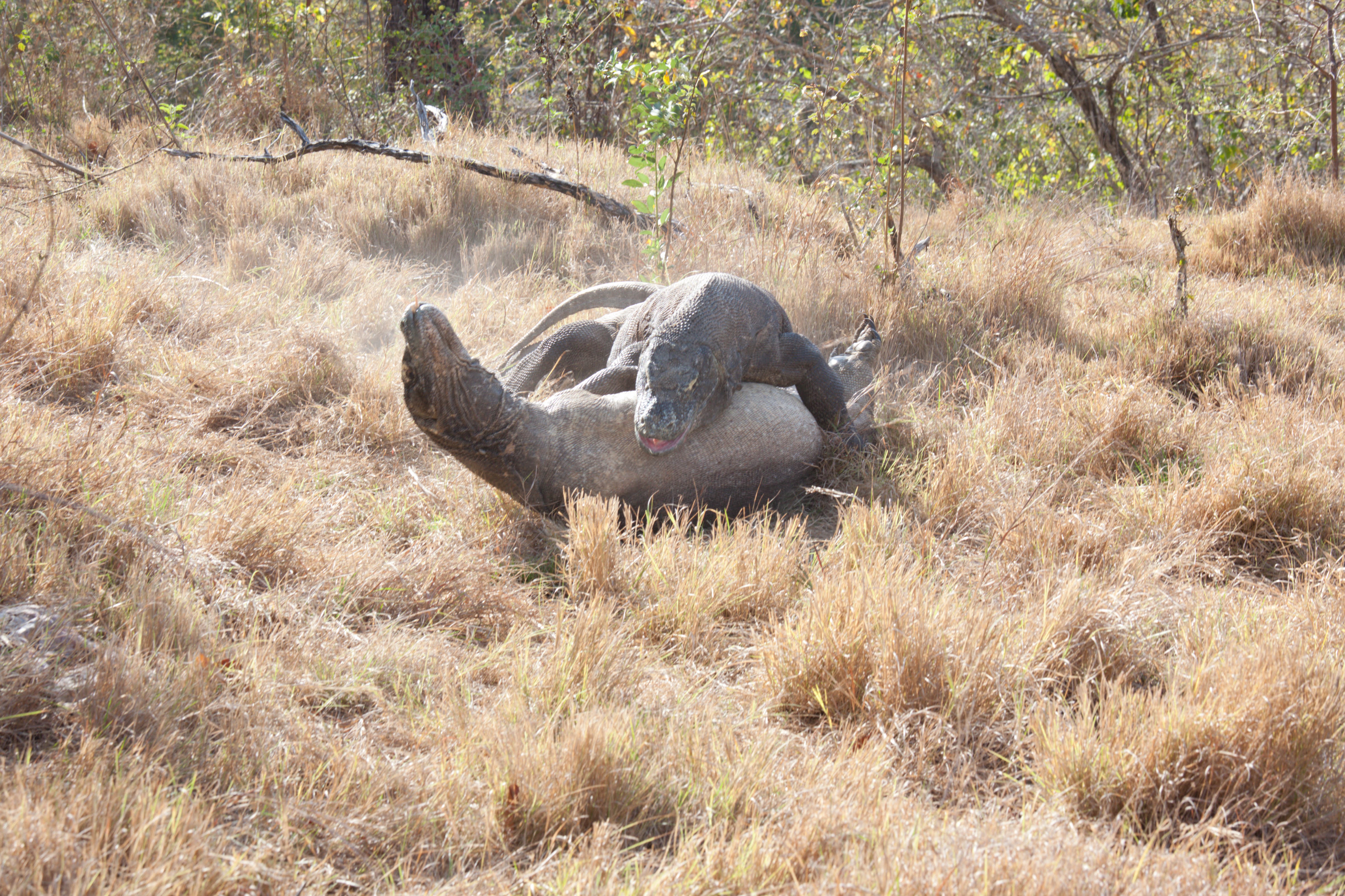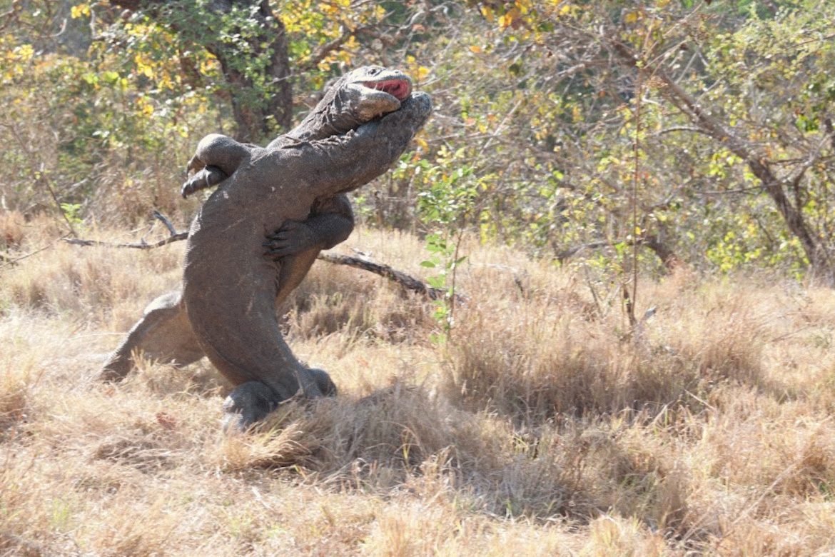 Zuerst dachten wir, wir beobachten ein Waran-Pärchen bei ihren Morgenritualen. Weit gefehlt! Es waren zwei Männchen - und was als gemütliches Sonnenbad begann, eskalierte binnen Sekunden zu einem erbitterten Kampf. So schnell, dass ich kaum noch scharfstellen konnte (Verzeihung für die verwackelten Bilder - aber bei "Komodo-Drachen-Duellen" hat man eben andere Prioritäten).